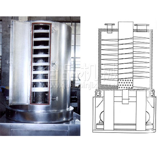濕物料自頂部加料口進(jìn)入螺旋床內(nèi),在周向激振力及重力的作用下,物料沿螺旋床自上而下作跳躍運(yùn)動直至底層;同時(shí),潔凈的熱風(fēng)由螺旋床底部進(jìn)入,與分布在床上的物料進(jìn)行充分的傳熱和傳質(zhì)后,由頂部排濕口排出。從而使物料達(dá)到了干燥的目的。